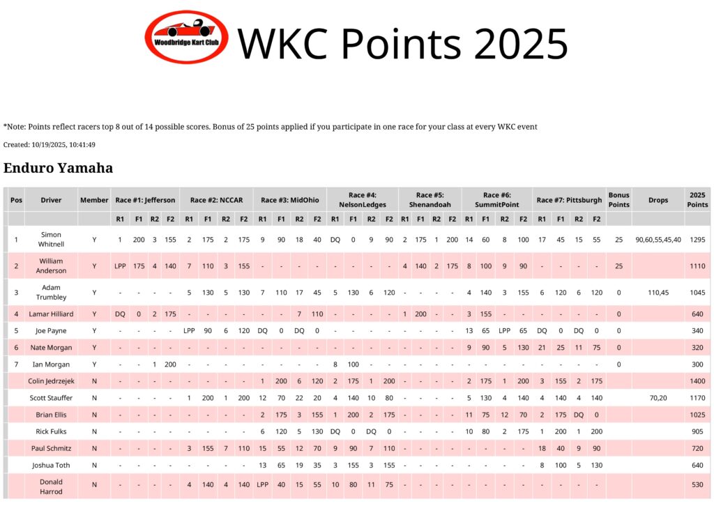 2025 WKC Road Racing Series Final Point Standings Posted November 10, 2025 - SUMMIT POINT, W. Va. — Point standings for the 2025 Woodbridge Kart Club Road Racing Series have been released at woodbridgekartclub.com. This year, seven races counted toward WKC points, including four WKC-hosted events between NCCAR and three circuits at Summit… Read more...