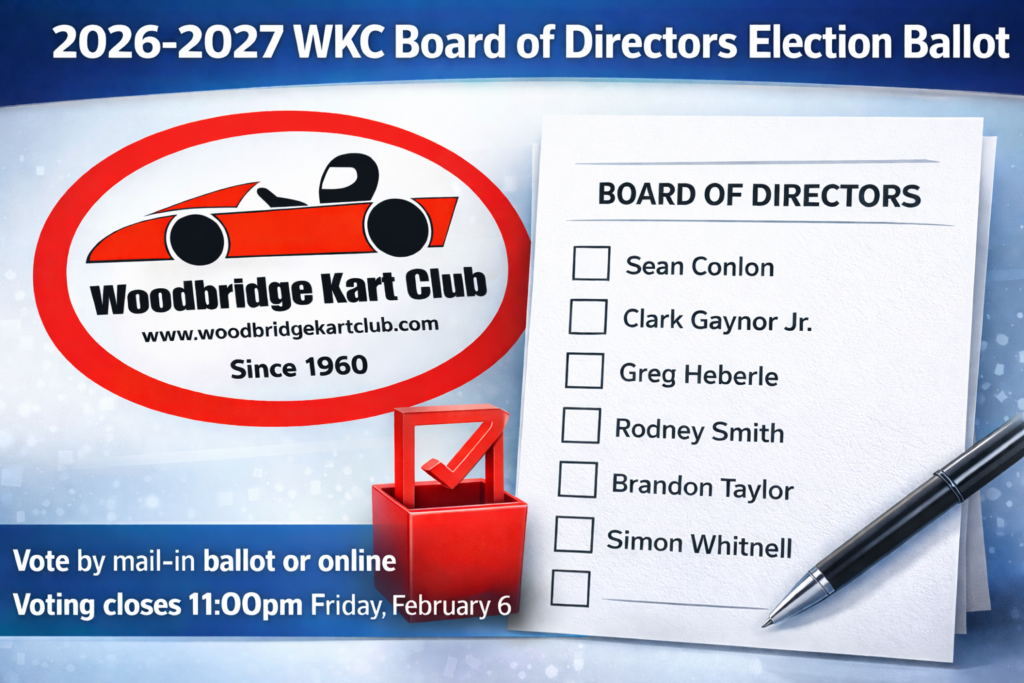 2026-2027 WKC Board of Directors Election Ballot January 8, 2026 - CHARLES TOWN, W. Va. — The ballot for electing five (5) members for the 2026-2027 Woodbridge Kart Club Board of Directors is now available. Members may print and mail the ballot, or vote online. The deadline for voting is 11pm… Read more...